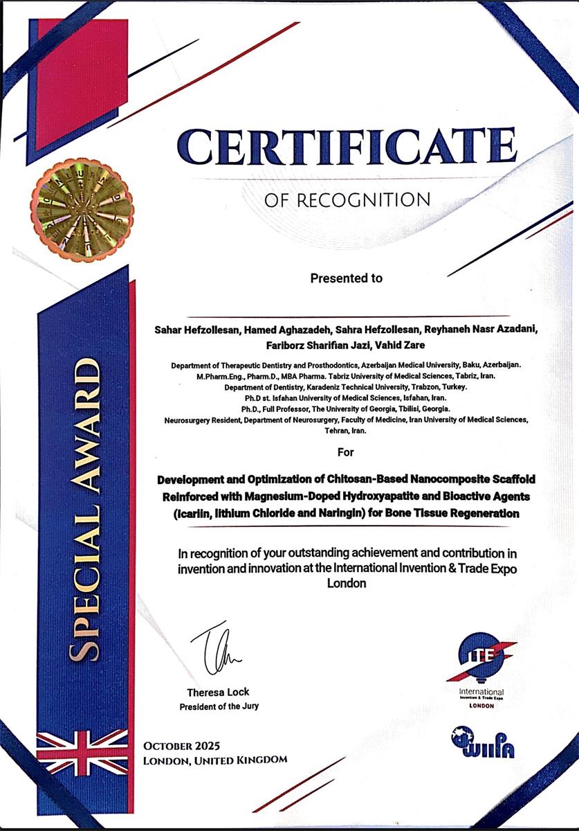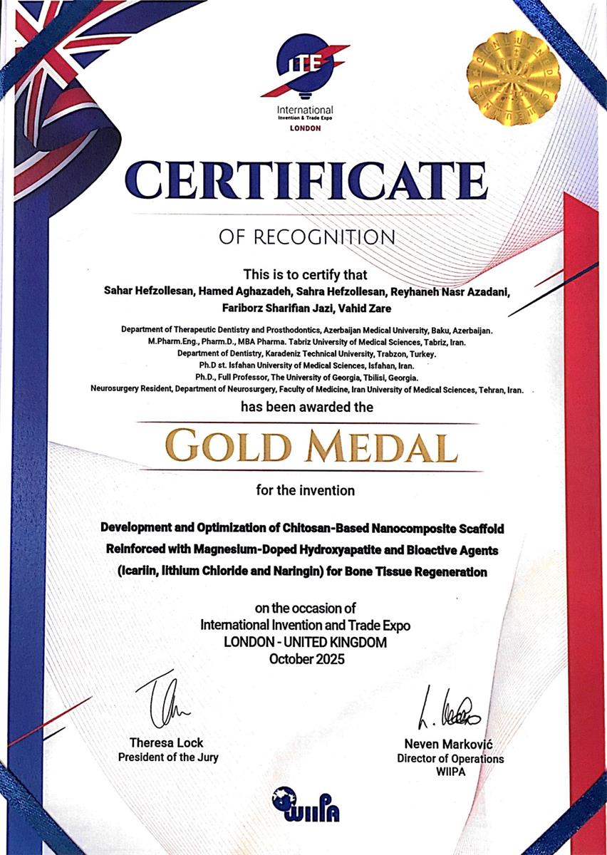 - Innovation title: Development and Optimization of Chitosan-Based Nanocomposite Scaffold Reinforced with Magnesium-Doped Hydroxyapatite and Bioactive Agents (Icariin, lithium Chloride and Naringin) for Bone Tissue Regeneration.